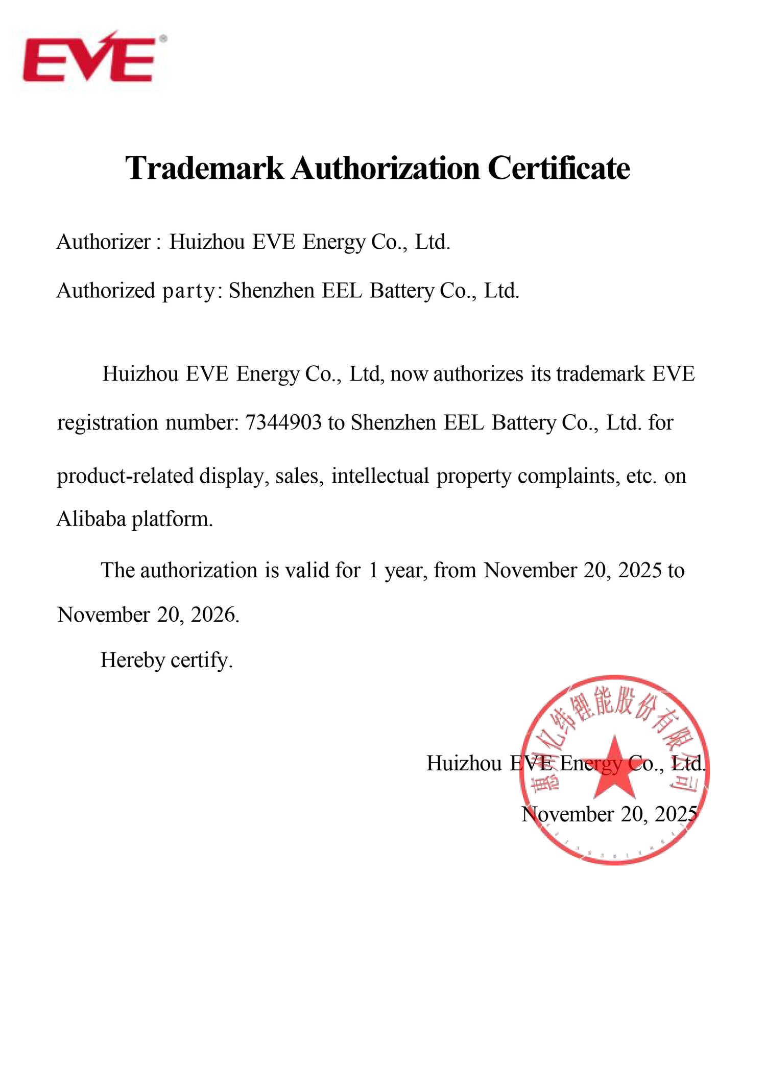 EEL Battery product-related has been granted authorization by EVE Energy Co., Ltd. to utilize its registered trademark EVE (registration number: 7344903) for various purposes such as product related display, sales, intellectual property complaints, and more.