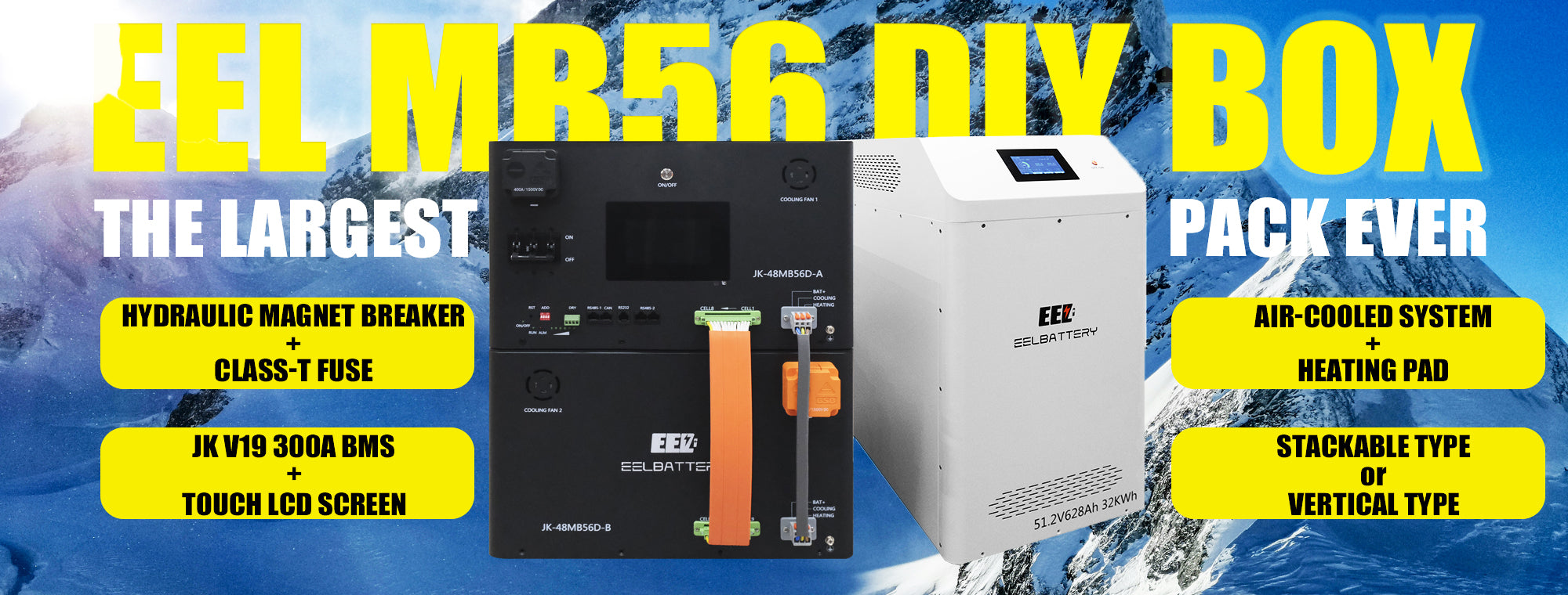 Designed for high-capacity home energy storage, the EEL 48V MB56 32kWh Battery Pack delivers reliable, long-lasting power for solar and off-grid systems. Built with premium EVE MB56 LiFePO4 cells and an advanced BMS, it ensures enhanced safety, stable performance, and extended cycle life.