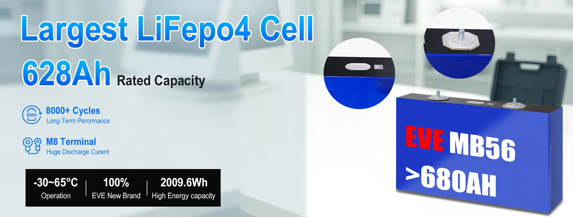 4 Stück 3,2 V 628 Ah EVE MB56 mit Doppelgewindebolzen, Klasse A, LiFePO4-Batteriezellen, volle Kapazität, China-Versand